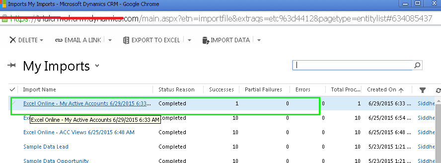 We can monitor the Import Job status from the Import Job. It shows the Creates and Updates performed in CRM due to the import. In our case it shows “Create” and “Update” as follows: