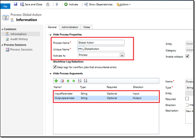 - Go to Settings → Processes → Click New then select category as “Action” and entity as “None(global)” as shown in below screenshot.