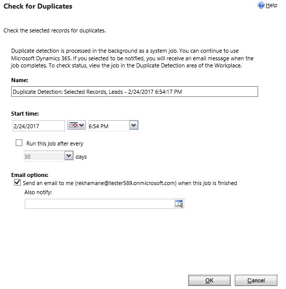 4. After clicking on the button, ‘Check for Duplicates’ window will open up. You can now give the name of the System Job where you can check the status. You have the option to mention the Start Time. You can also mention after how many days you want to run this System Job.