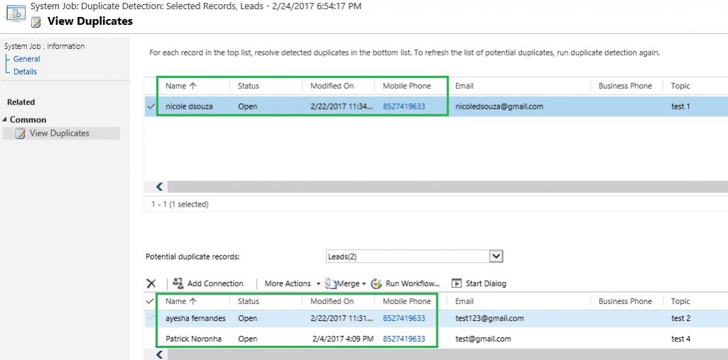 6. Open the system job. You can see that the duplicates are detected for the same ‘Mobile Phone’ number.