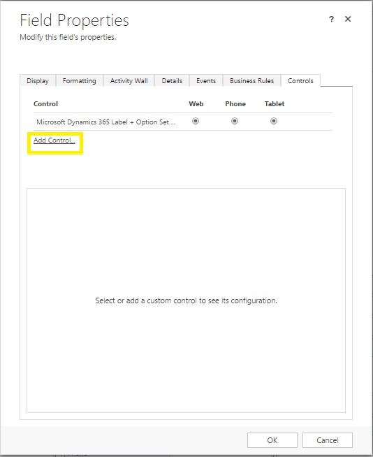 - Go to the ‘Field Properties.’ Select the Controls tab and click on ‘Add Control’ as shown in the screenshot below;