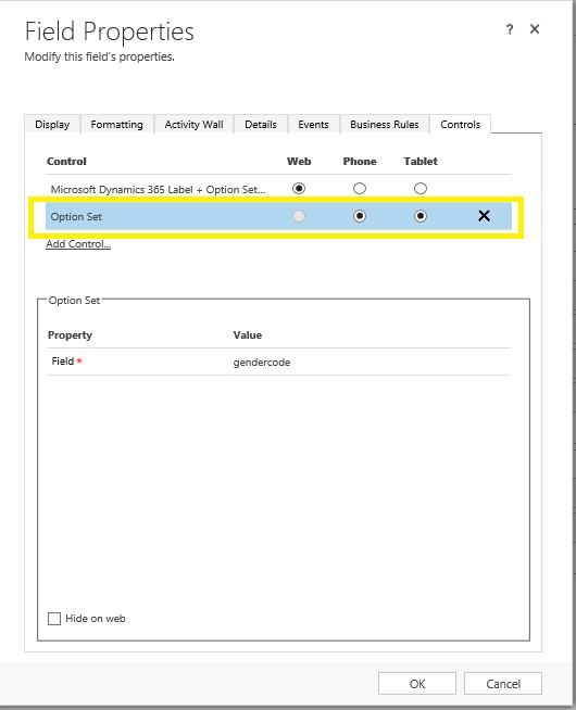 - Open the entity form and select the ‘Gender’ option set type of field to add Option Set control as seen in the screenshot below;