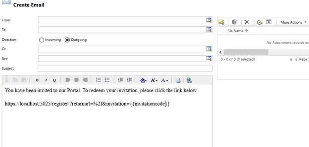This step creates an email record where we need to add an invitation link in the email body. Append the invitation code that we generated and saved on the Invitation record, at the end of portal invitation URL.
