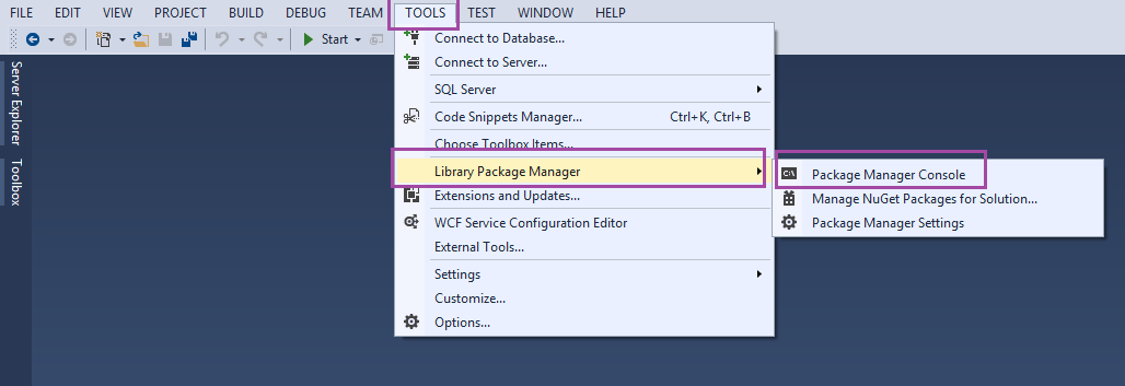 Navigate to Visual Studio Project → Tools → Library Package Manager → Package Manager Console