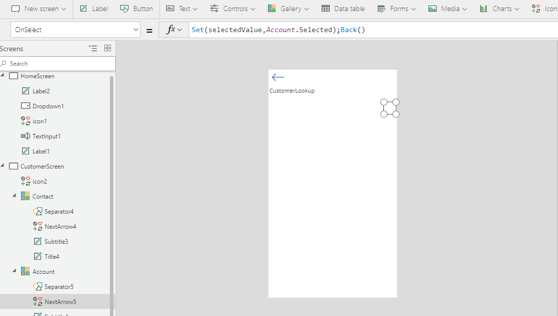 Step 12: To display selected data on HomeScreen Textbox, use Set function on OnSelect property of nextArrow Icon as shown in screenshot.