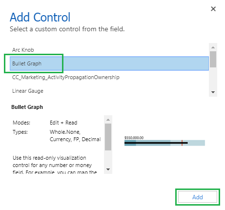 After clicking “Add Control” button the following window will get open and it will shows list of all controls, Select “Bullet Graph” control from the list and then click on “Add” button.