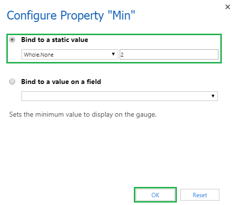 To set values using “Bind to a value of a field” we need to select “Bind to a value of a field” radio button, select the field of whose value we want to use as Minimum Value, Maximum Value, Good Value, Bad Value or Target Value and then click on “OK” button.