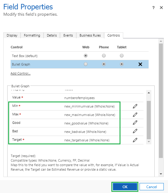 Then select Phone and Tablet radio buttons to show this control on Phone and Tablet, and then click on “Configure Property” button to set Minimum, Maximum, Good, Bad and Target values.