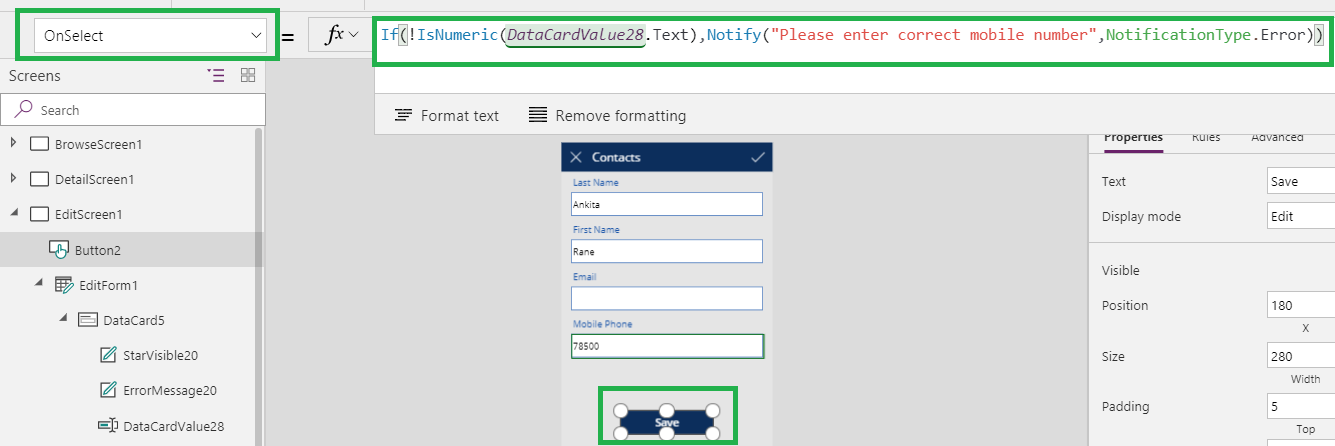 If (!IsNumeric(DataCardValue28.Text),Notify(“Please enter correct mobile number”,NotificationType.Error))