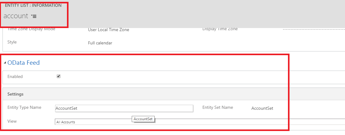 First we will create the entity list. On the entity list there is tab “OData” where we need to fill the information like “Entity Type Name”, “Entity Set Name”, select the view and enable the Odata feed as shown in the below screenshot: