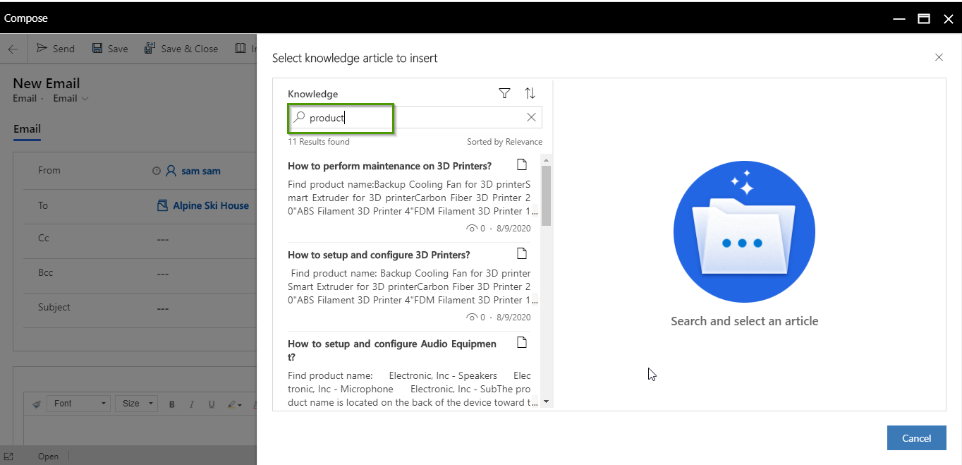 1. Users can now insert ‘Knowledge Articles’ in an email.