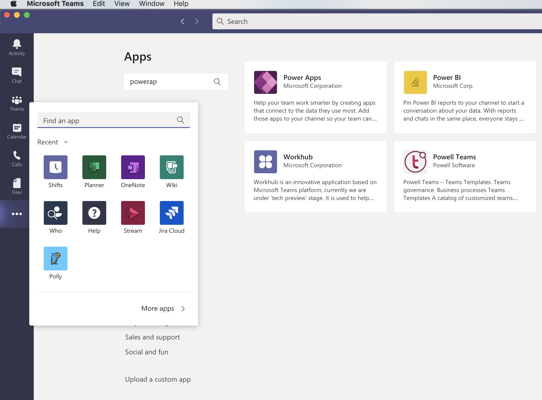Begin with adding Power Apps App to your team. Click on the ellipsis (…) and more apps and look for Power Apps as shown below