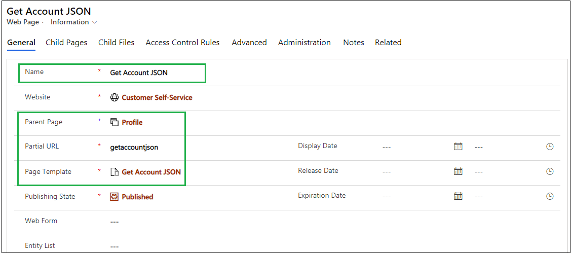 3. After that create Web Page record and set Get Account JSON Page Template in Web Page as shown below. Also, the Partial URL will be useful to retrieve JSON.