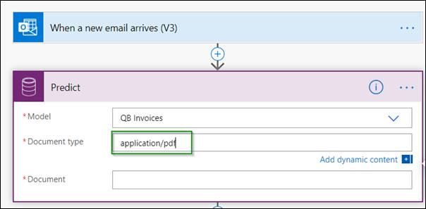 Specify the type of data that we will be sending to “Predict”. AI builder supports both pdf and image. In this illustration, we are going to send invoice as a pdf so let’s fill the field as shown below