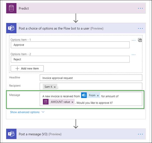 We will update the message field as shown below since we want to be able to see who the invoice is from and also the total invoice amount (we are extracting this amount value from AI builder and building a relevant approval request sentence for an approver with the information they need using dynamic content)
