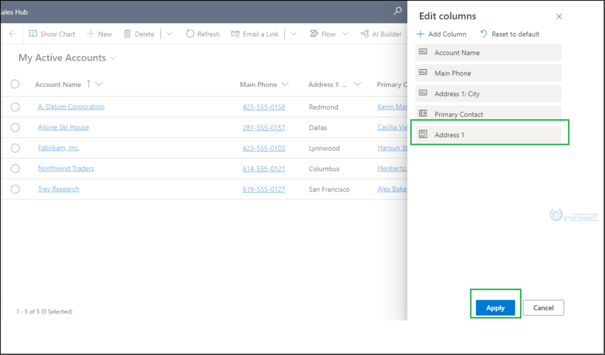Please click on the Apply button. The selected column will be visible on the HomeGrid of the Account entity.