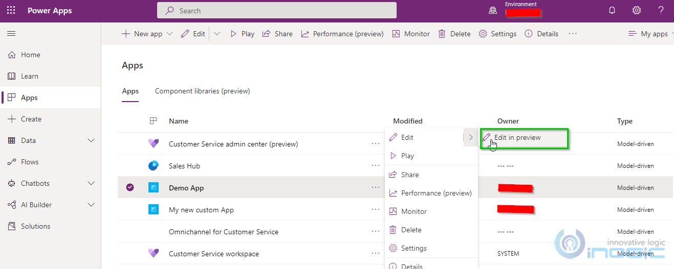 3. Select More (…)>> Edit >> Edit in preview to open the modern app designer.