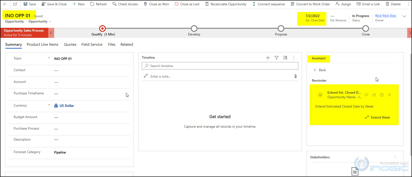 Every day at 12.00 PM, we will check the opportunities whose estimated closed date is in the next 7 days and create an insight card for that opportunities to extend the estimated closed date by a week. The Assistant will notify the salesperson to extend the estimated closed date.