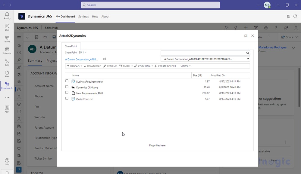 This streamlined approach allows you to access all your SharePoint-stored files and folders directly from CRM. You can make necessary updates and perform various tasks without the need to switch between different tabs.