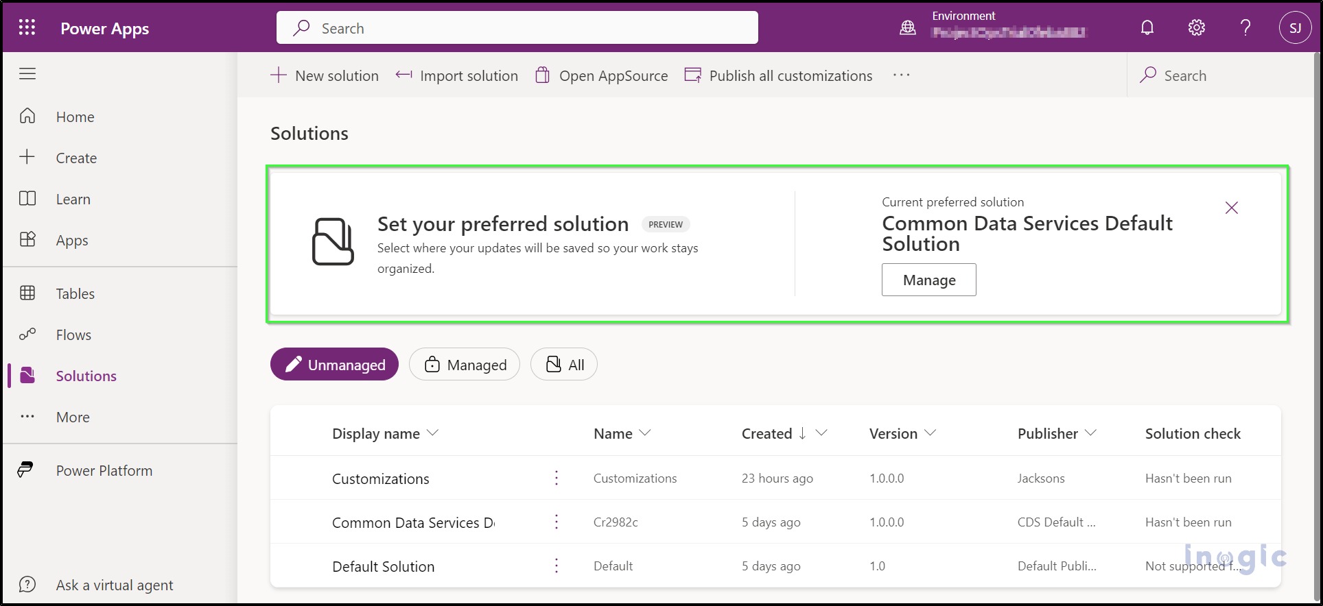 By default, the ‘Default Solution’ is set as the preferred one. Click on the ‘Manage’ button, and you’ll be able to choose your unmanaged solution as the preferred option. For example, you can create an unmanaged solution named ‘Customizations’ and select it as your preferred solution.